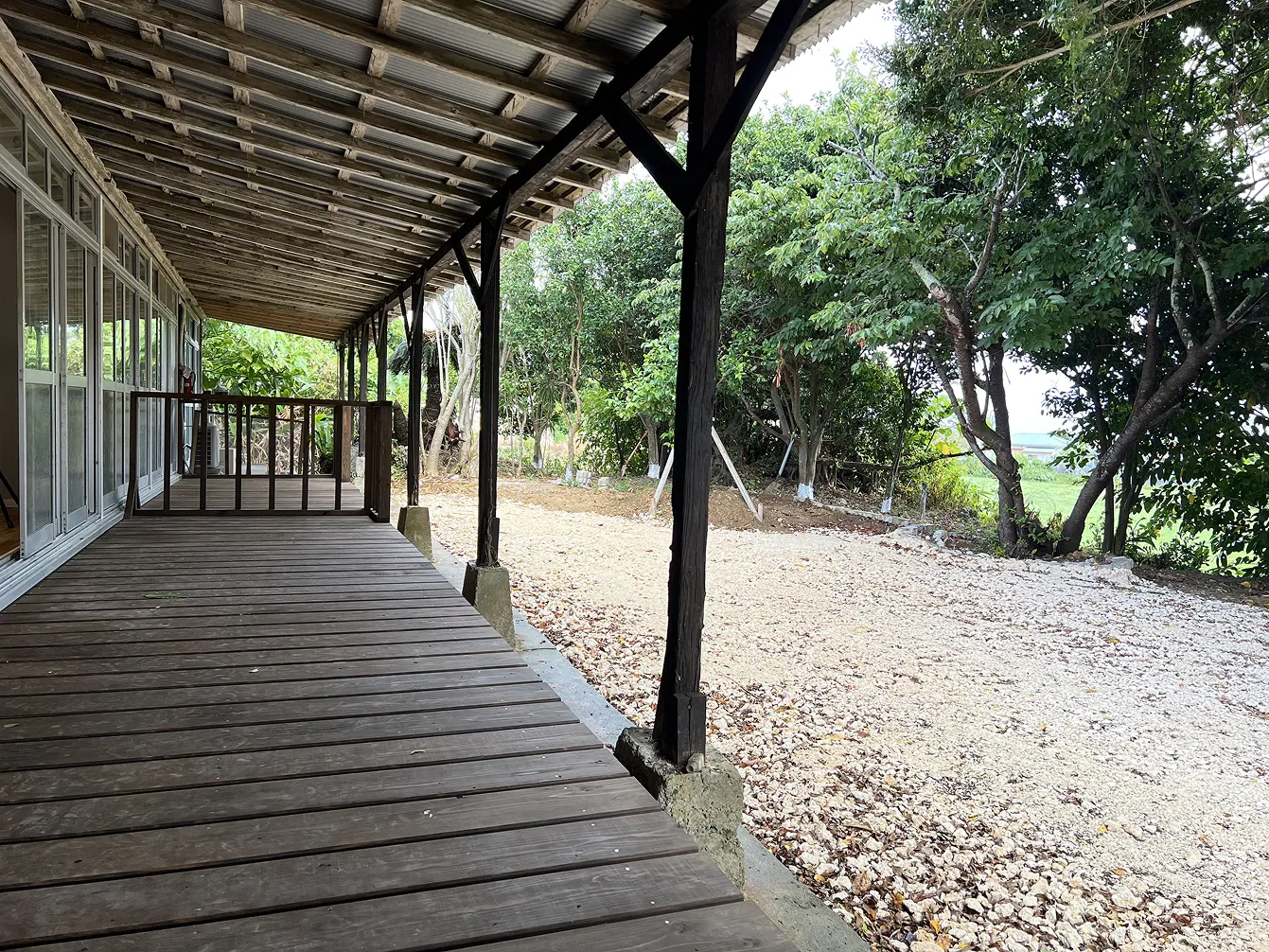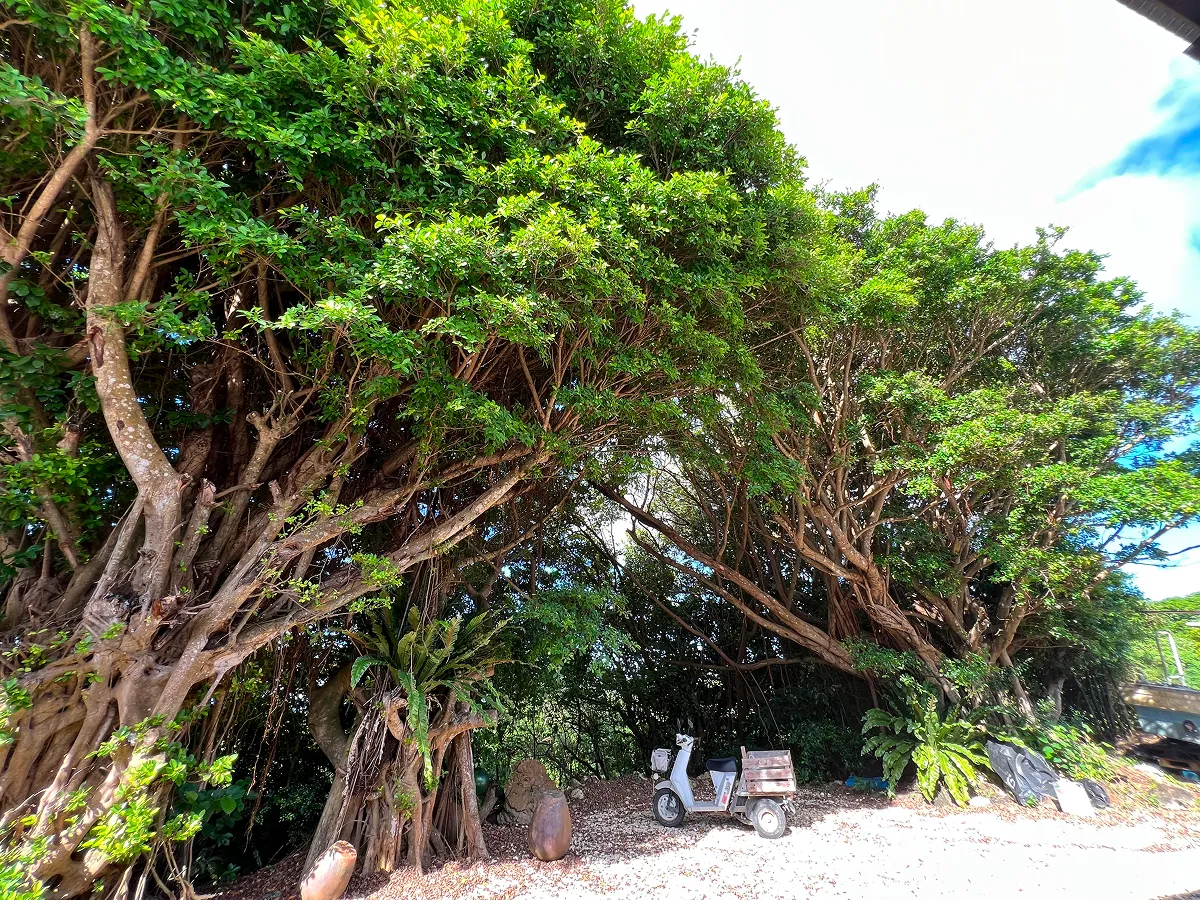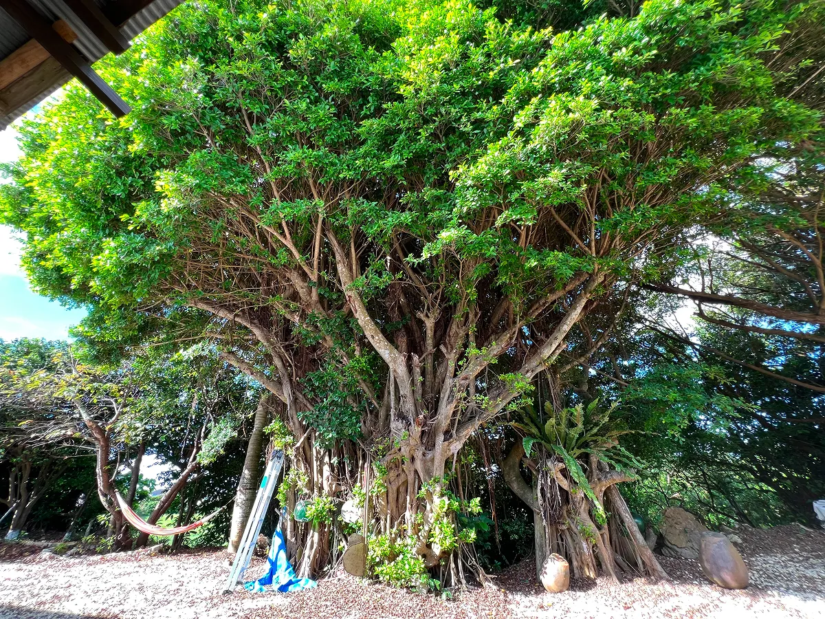 与論島の静かな集落に佇む宿「HOSTEL あざみ庵 よろん」。ガジュマルの木陰と畳の温もりに包まれ、ゆったりと島時間を過ごせます。キッチンや洗濯機も備え、長期滞在やひとり旅にも最適な癒しの宿です。