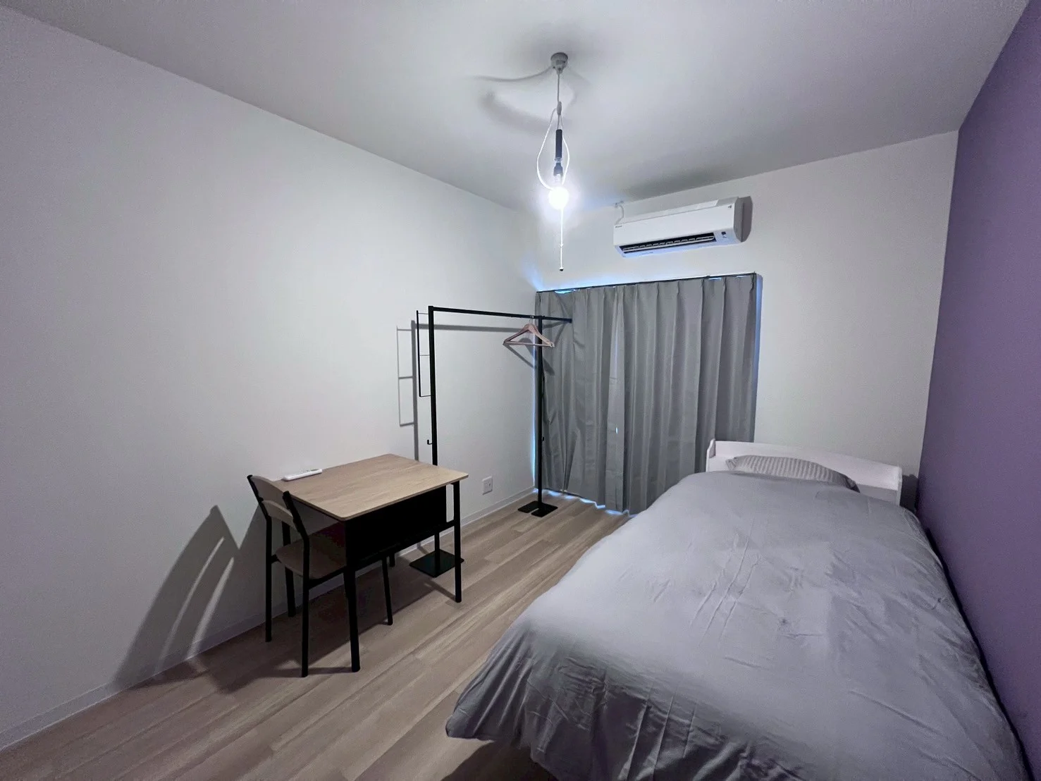 布団、テーブル、クローゼット、ゴミ箱、物干し竿、スリッパ、鏡