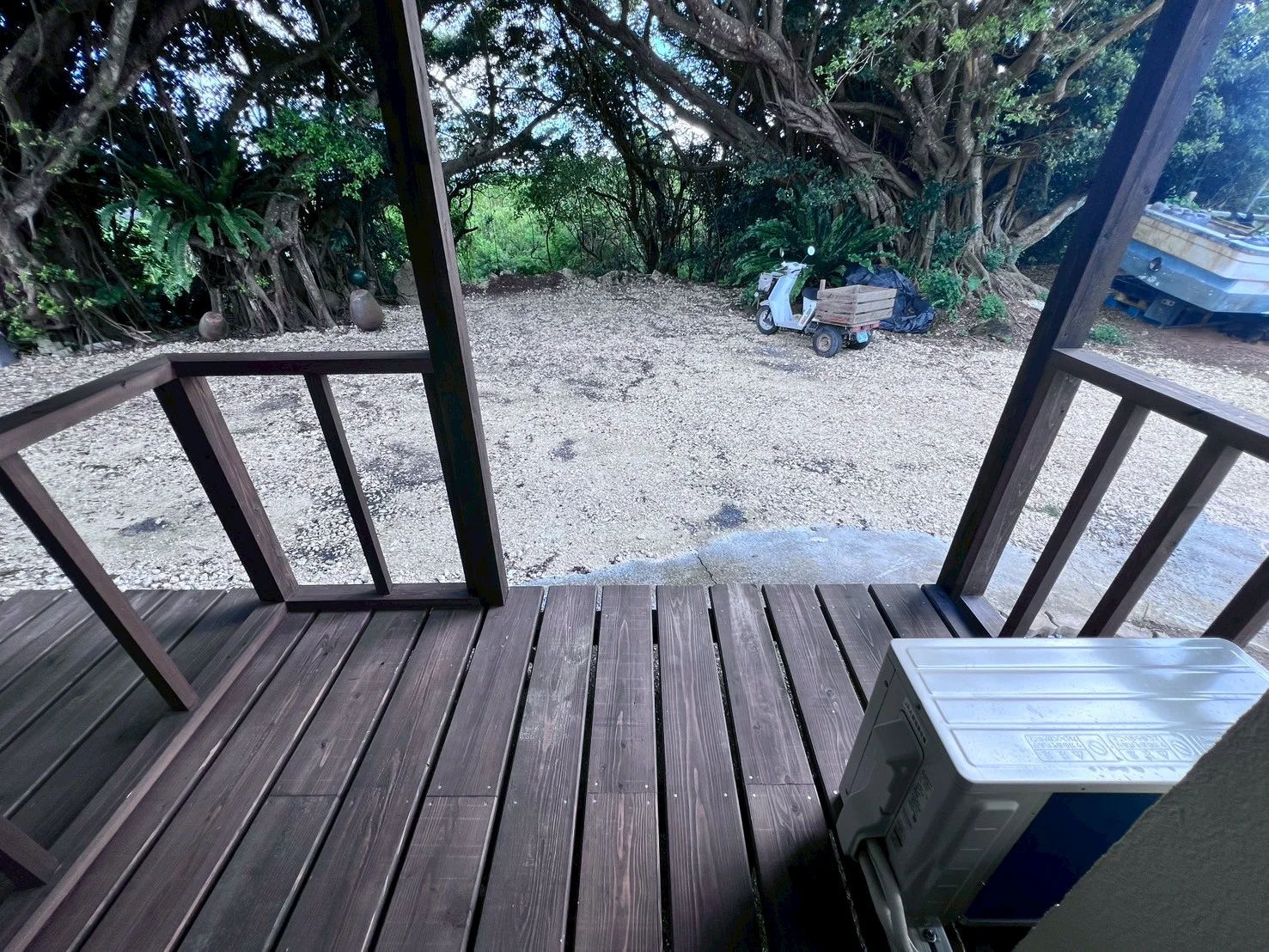 与論島の静かな集落に佇む宿「HOSTEL あざみ庵 よろん」。ガジュマルの木陰と畳の温もりに包まれ、ゆったりと島時間を過ごせます。キッチンや洗濯機も備え、長期滞在やひとり旅にも最適な癒しの宿です。