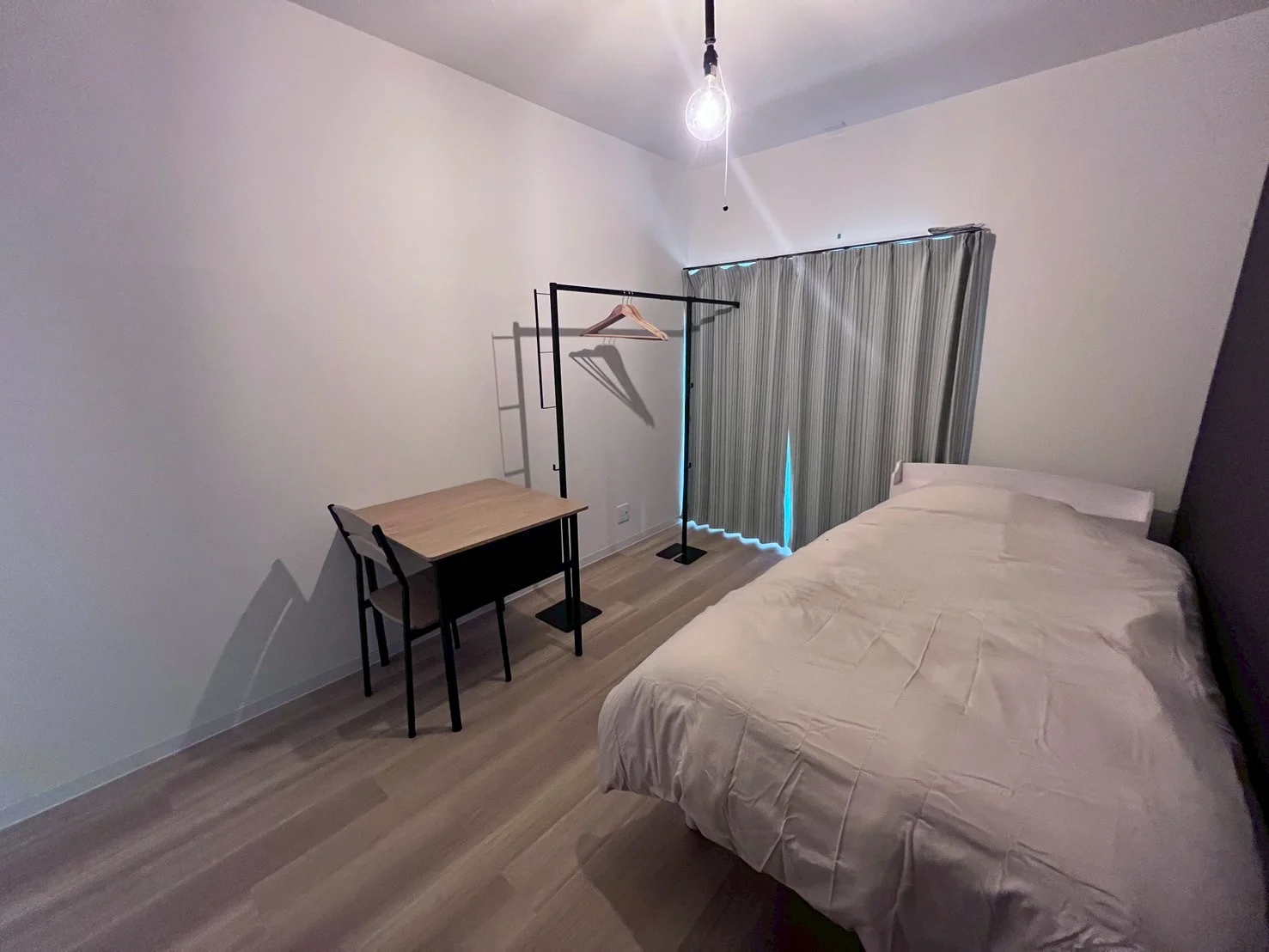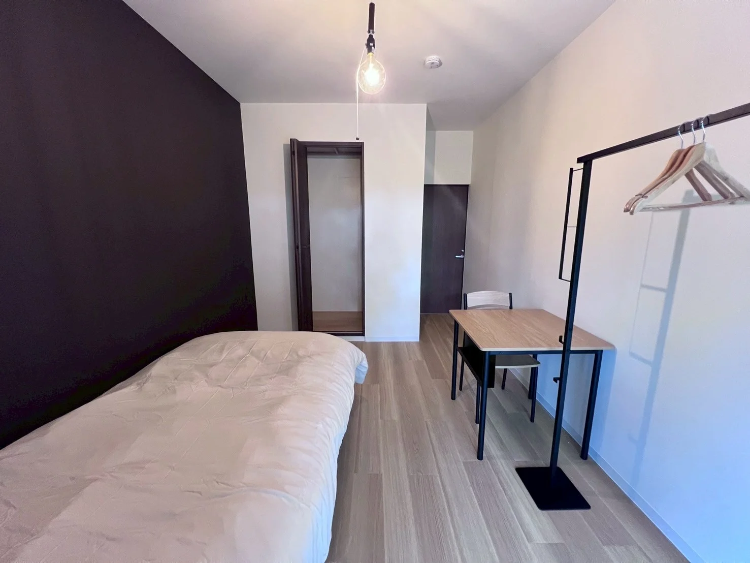 布団、テーブル、クローゼット、ゴミ箱、物干し竿、スリッパ、鏡
