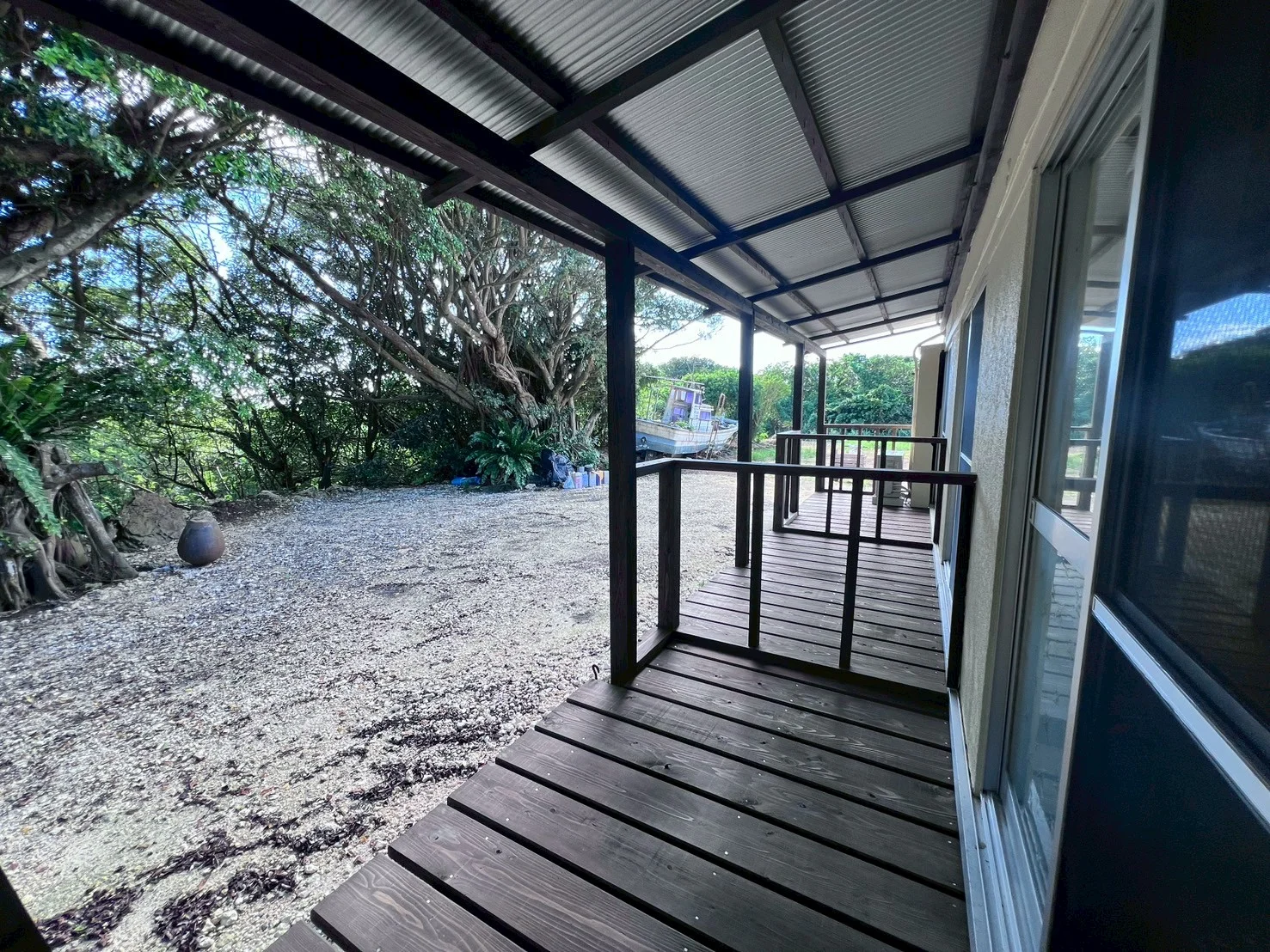 与論島の静かな集落に佇む宿「HOSTEL あざみ庵 よろん」。ガジュマルの木陰と畳の温もりに包まれ、ゆったりと島時間を過ごせます。キッチンや洗濯機も備え、長期滞在やひとり旅にも最適な癒しの宿です。